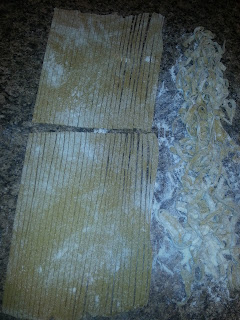 In a large bowl, whisk together wheat flour and salt. Make a well in the middle of the flour and add remaining ingredients. Mix with your hands until you form your dough. Knead a bit until it is combined well. Add more flour if necessary. Next, roll your dough out on the counter top as thin as you can, about 1/8", adding flour as necessary to prevent dough from sticking. The thinner the dough, the better your noodles will be. (This makes about 1 1/4 lbs of pasta dough.)